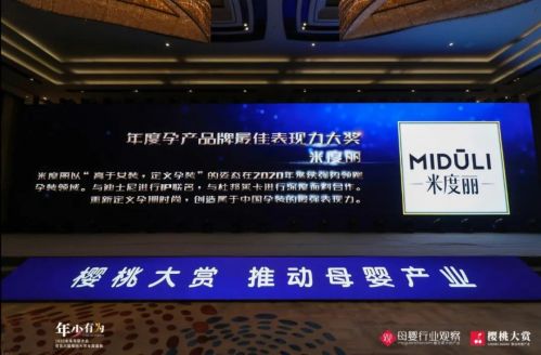 本次櫻桃大賞頒獎盛典由母嬰行業觀察主辦,以“年少有為”為主題。旨在表彰母嬰商業領域的創業創新、致敬行業標桿、發掘新生力量,推動母嬰產業發展。2020櫻桃大賞年度盛典權威頒發【企業獎】、【產品獎】等年度大獎,米度麗品牌憑借2020年的強勢表現以及產品的創新升級在【企業獎】層面獲得年度孕產品牌最佳表現力大獎,在【產品獎】層面獲得年度顏值產品大獎!以強勢的表現領跑孕裝領域,用絕對的實力書寫“年少有為”!