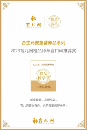 合生元旗下“合生元嬰童營養(yǎng)品系列”憑借其科學(xué)的營養(yǎng)配比、對安全品質(zhì)的堅守以及在母嬰行業(yè)的超高專業(yè)度,榮獲2023育兒網(wǎng)橙品種草官口碑推薦獎,產(chǎn)品獲得了育兒網(wǎng)媽媽們的一致口碑好評。